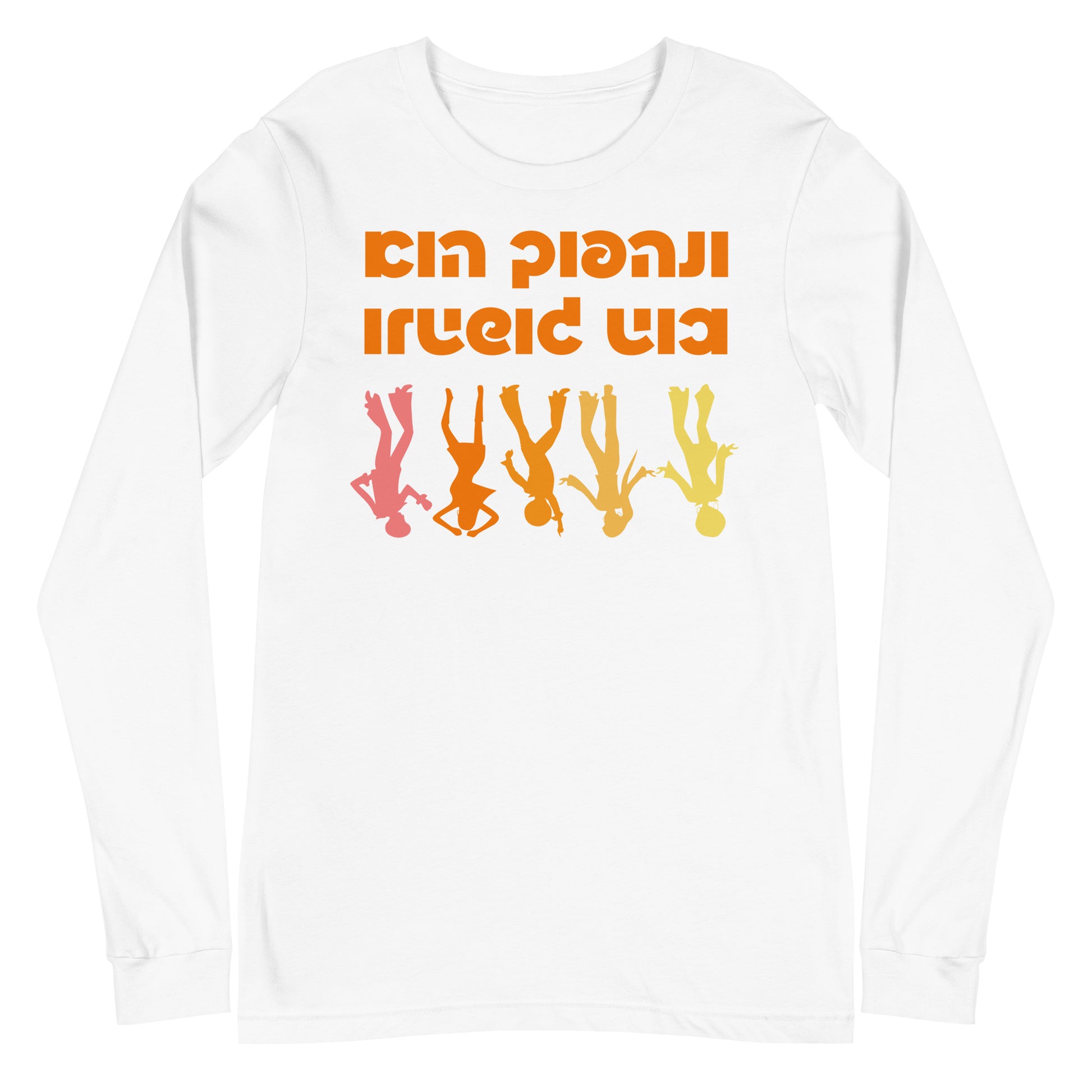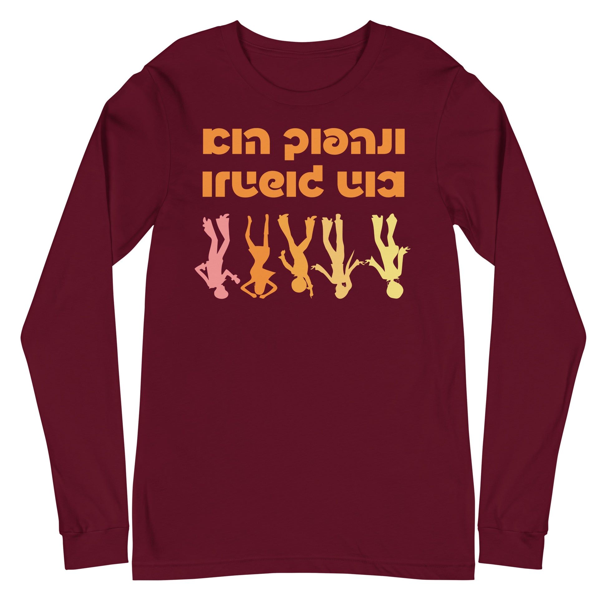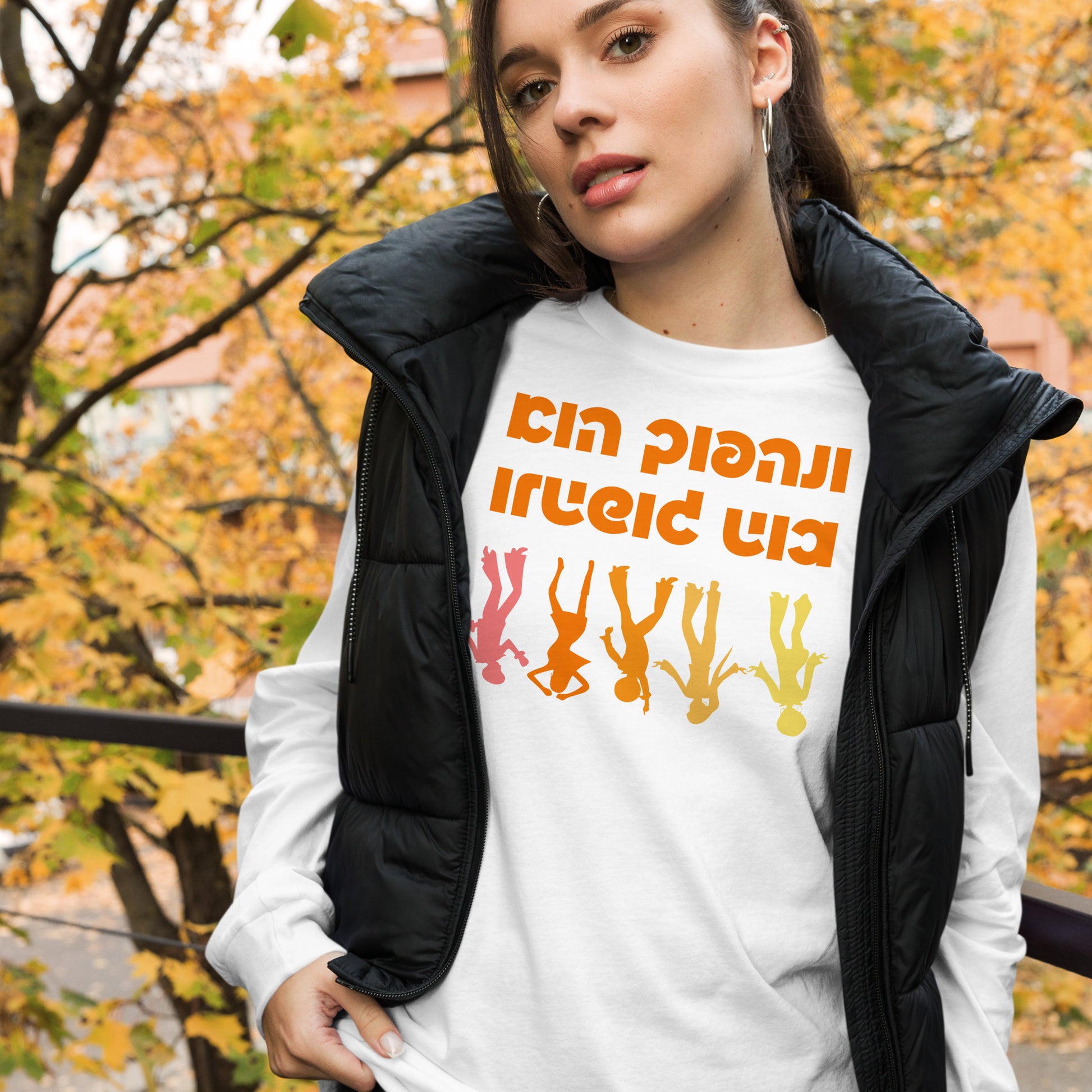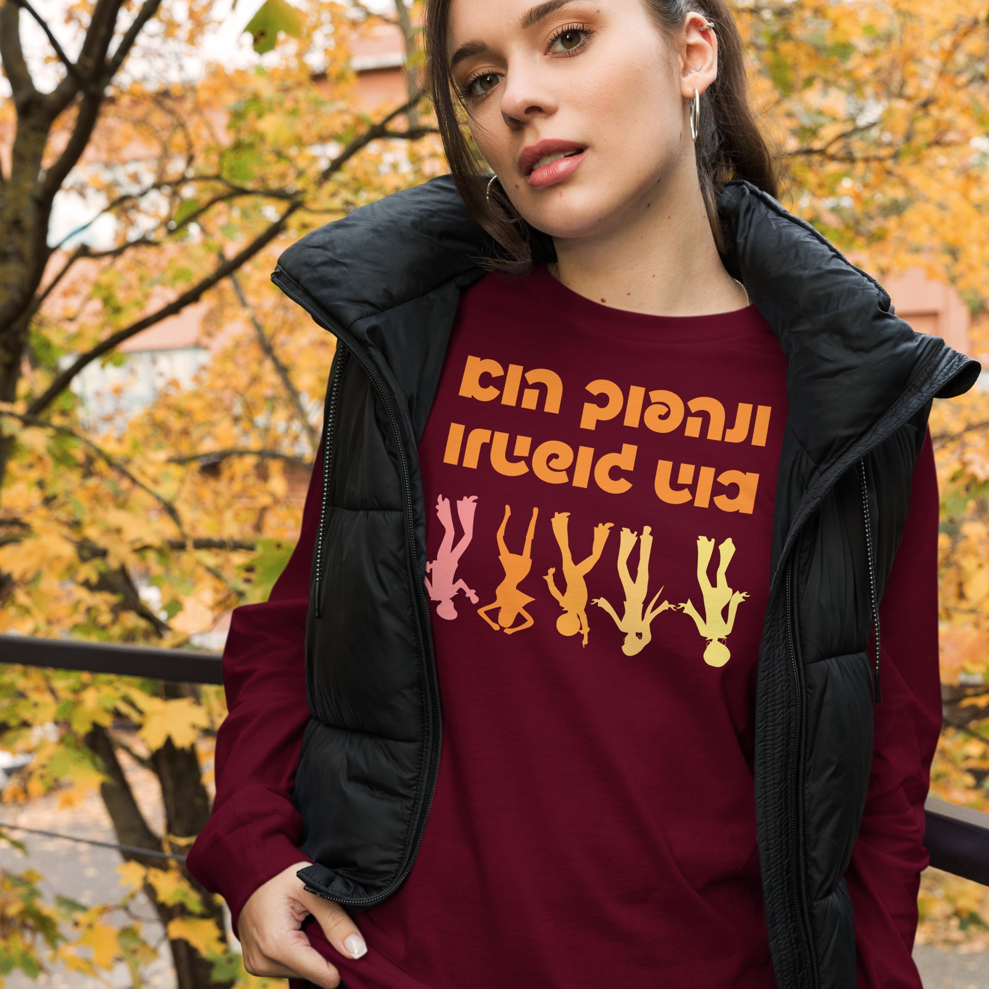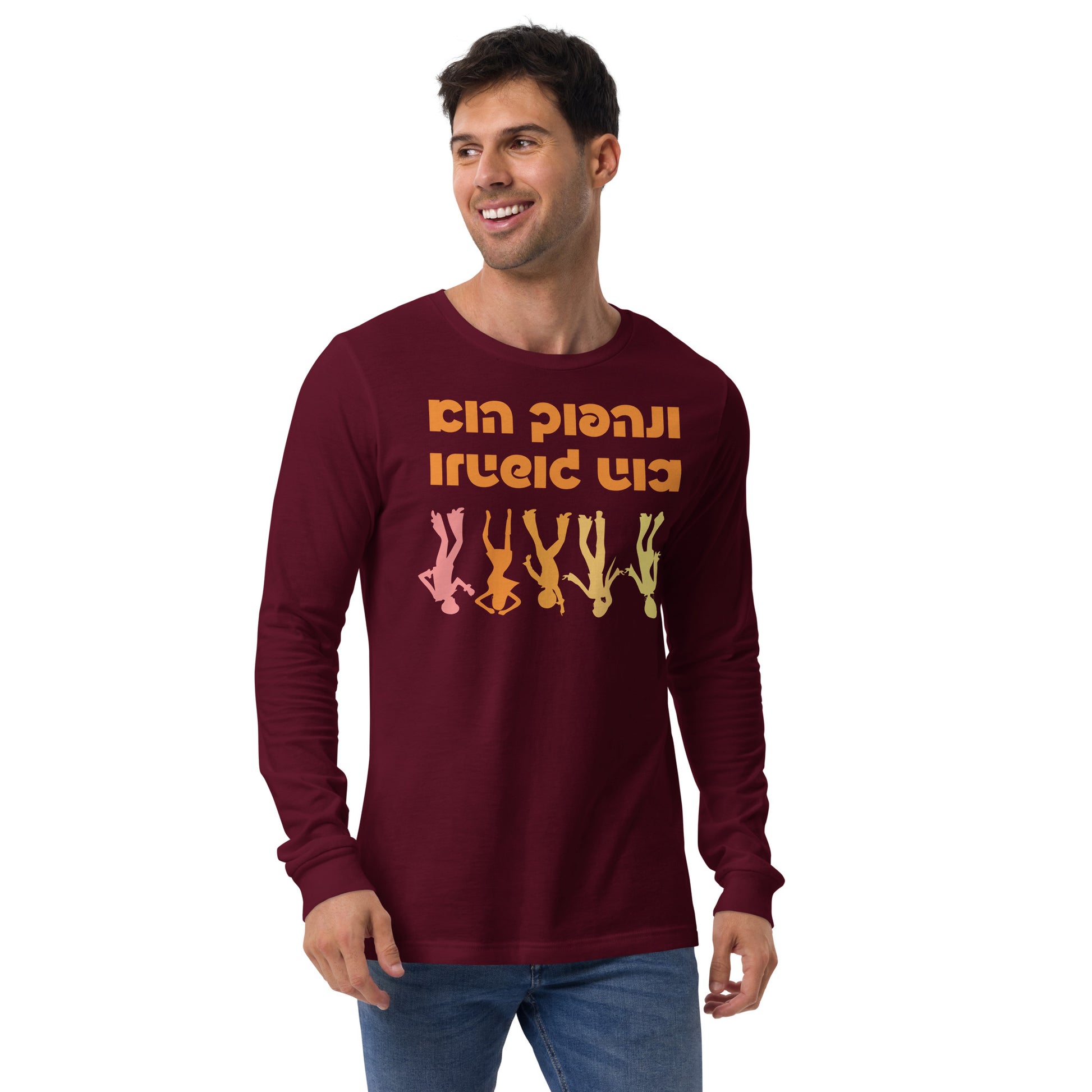 Purim is all about surprises, twists, and turning things upside down—just like this eye-catching V’nahafoch Hu long-sleeve tee! Featuring the classic Purim phrase "V’nahafoch Hu" (It was turned upside down) written completely flipped, this bold design is a fun, stylish way to celebrate the topsy-turvy spirit of the holiday. Plus, the playful silhouette graphics of people flipping and tumbling make it even more festive!