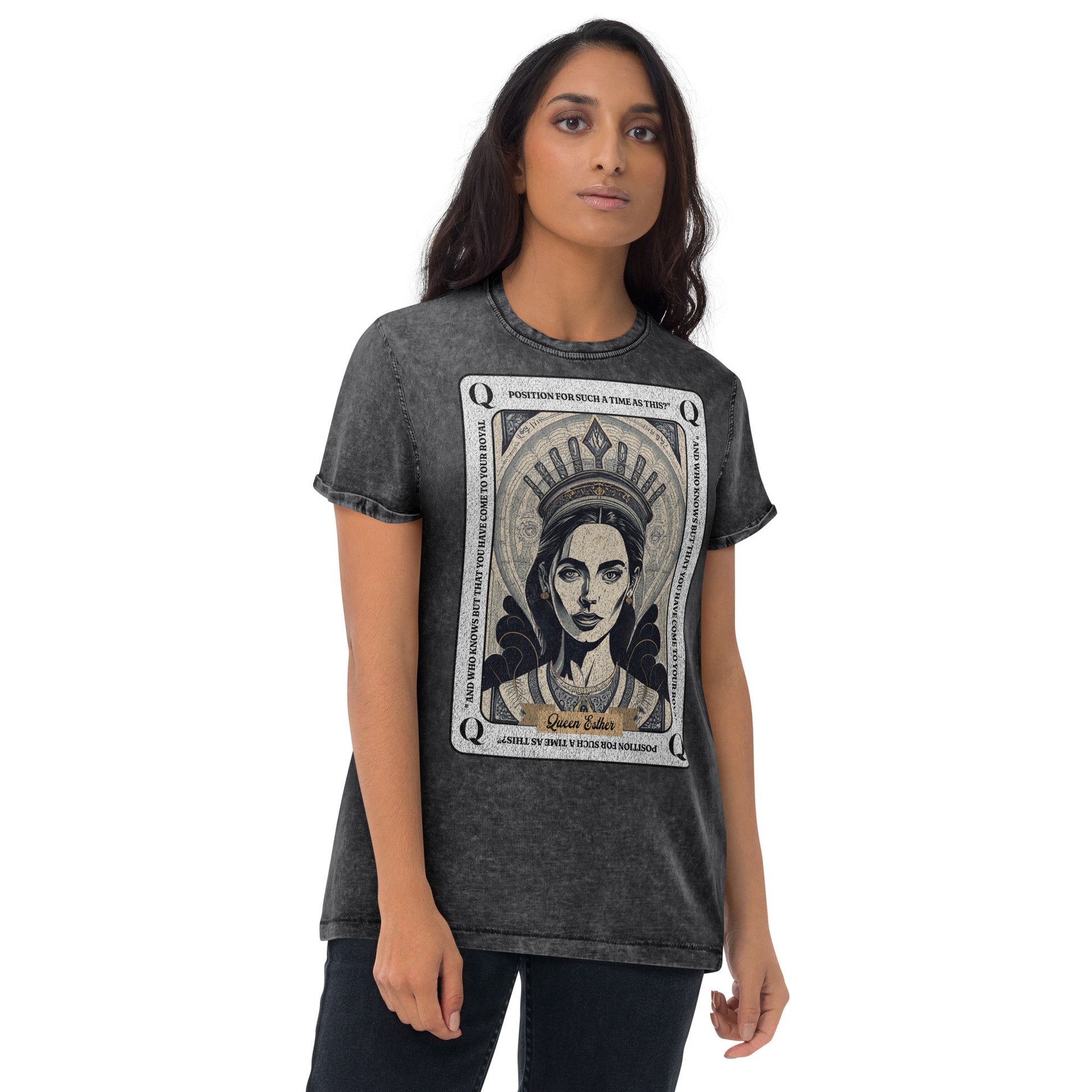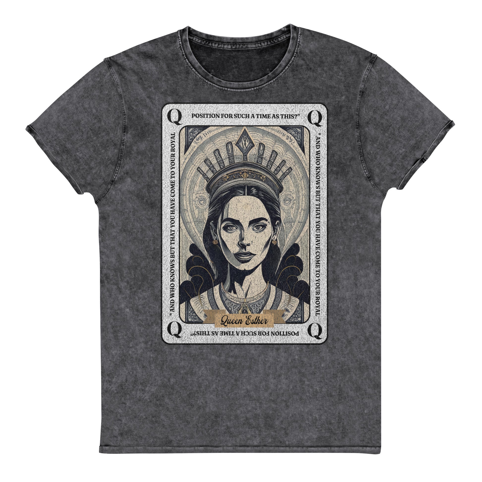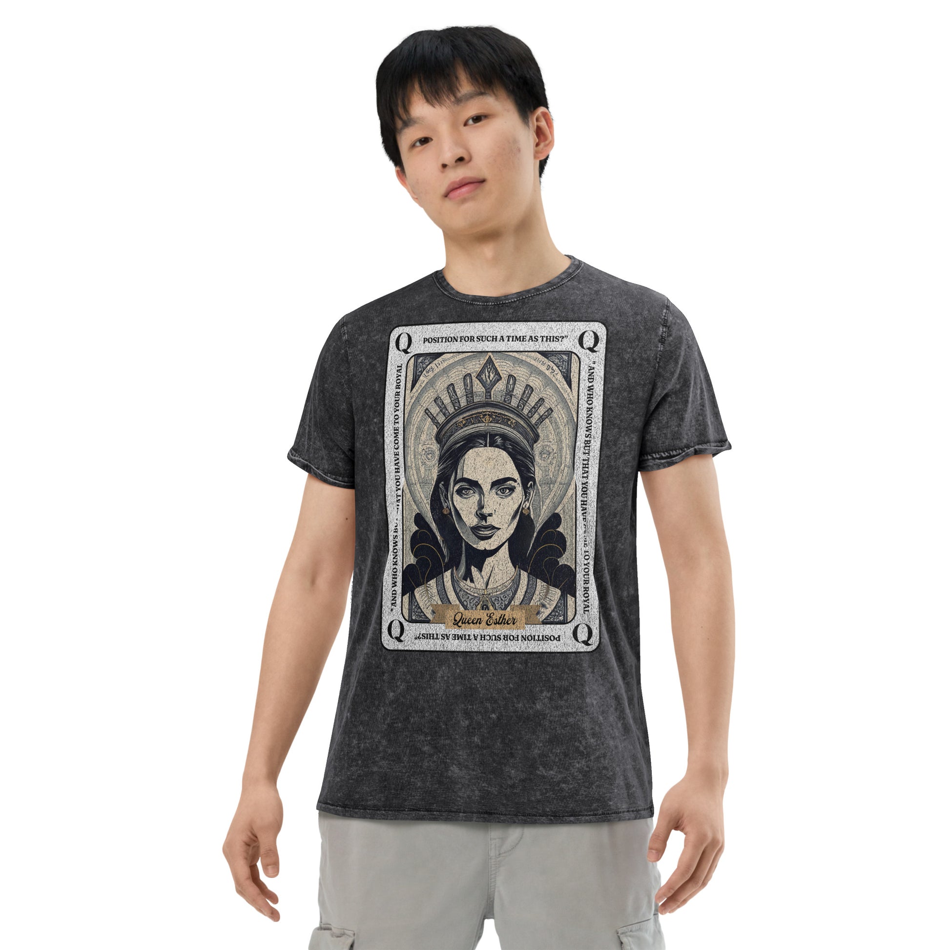 Channel the strength, courage, and wisdom of Queen Esther with this stunning denim playing card tee. Designed with intricate details, a distressed, royal aesthetic, and the iconic verse “And who knows but that you have come to your royal position for such a time as this?”—this shirt is a powerful tribute to one of the most legendary Jewish heroines.